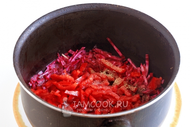 Далее добавьте сладкий перец и душистые специи. Я добавляю хмели-сунели, сразу же по всей кухне плывут ароматы... Жарьте еще три минуты. Затем содержимое сотейника залейте водой, чтобы овощи покрылись ею, и поставьте тушить под крышкой, на малом огне, до мягкости свеклы.