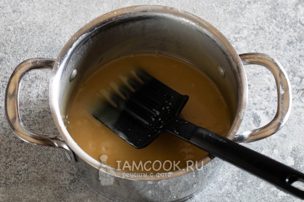 Сварить чуточку коричневатый сахарный сироп из 100 г сахара и 1 ст.л. воды, при постоянном промешивании влить в него по лопатке сливки и при периодическом промешивали уварить сироп до консистенции жидкого соуса (минут 10). Поставить остывать.