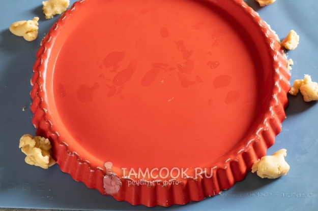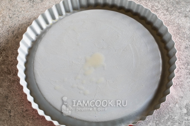 Смазать эмульсией для форм, смешанной из 1 ч.л. муки и 2 ч.л. растительного масла, форму диаметром около 28 см с волнистыми бортиками. Поставить ее в морозилку.