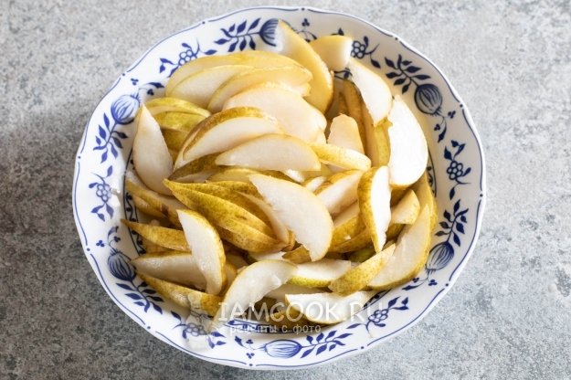 Груши нарезать на тонкие дольки, предварительно удалив семенную часть.