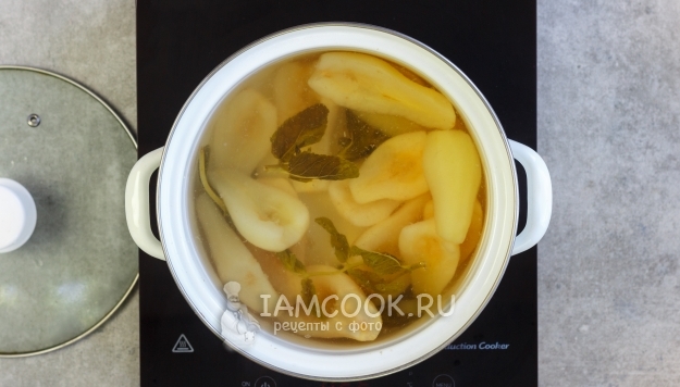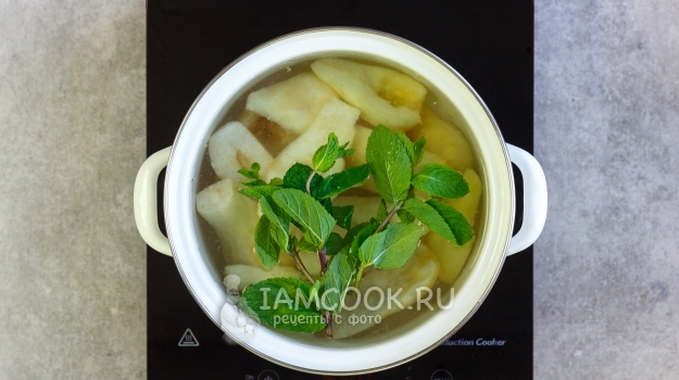 Отмерьте в кастрюлю воду, добавьте подготовленные груши и 3-4 веточки мяты.