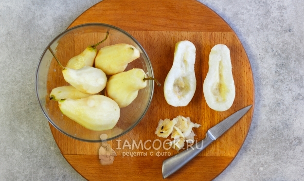 Очистите груши от кожуры. Разрежьте каждую грушу на 2 половинки, удалите семена и сбрызните лимонным соком, для того чтобы мякоть не потемнела.
