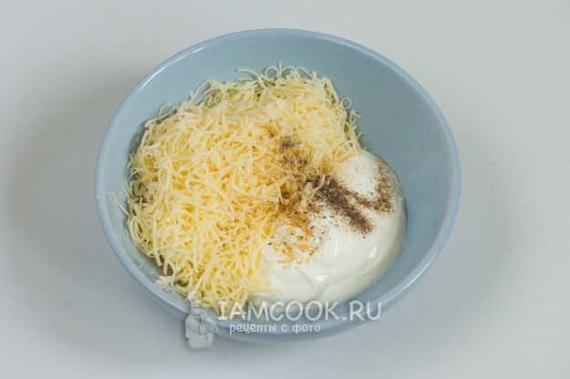 Приготовьте сметанный соус. Для этого соедините натертый на мелкой терке сыр и сметану, добавьте соль мелкую по вкусу и пряности (например, черный молотый перец, асафетиду).
