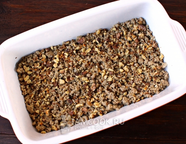 В форму выкладываем половину фарша, присыпаем половиной измельченных орехов.