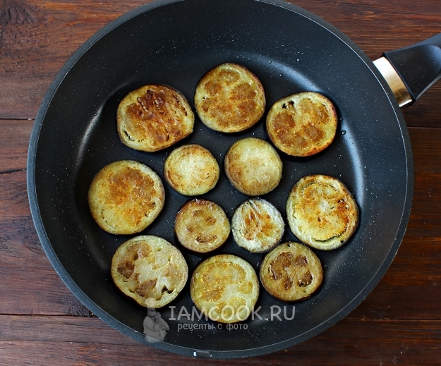 В сковороду наливаем растительное масло, разогреваем, затем огонь убавляем. Выкладываем кружочки баклажанов и обжариваем с двух сторон на среднем огне, до умеренного зарумянивания. Можно обжаривать одновременно на двух сковородках.
