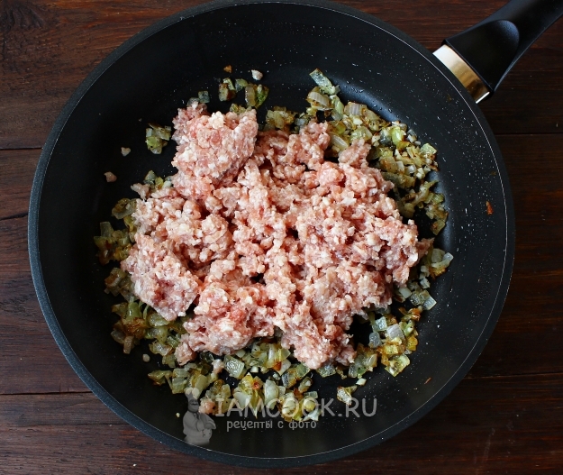 Добавляем в сковороду фарш. У меня свиной, вы можете использовать тот фарш, который вам больше нравится. Жарим, разбивая комочки, примерно 10 минут.