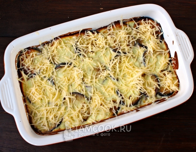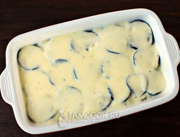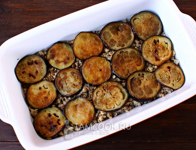 Сверху раскладываем половину баклажанных кружков. Слои повторяем.