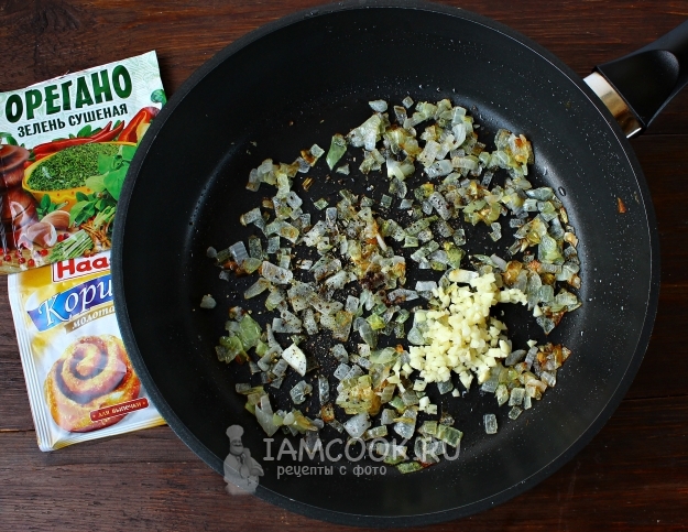 Затем к луку добавляем измельченный чеснок, перец, корицу и орегано. Перемешиваем и продолжаем готовить, помешивая, в течение минуты на небольшом огне.