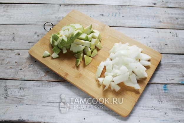 Нарежьте все овощи среднего размера кубиками: кабачки, репчатый лук.