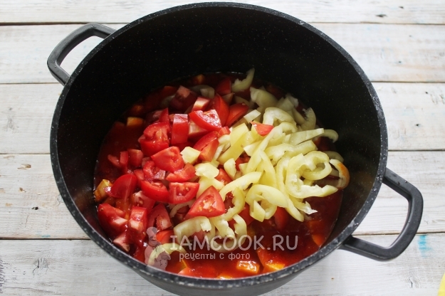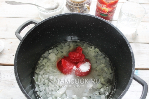 Добавьте в казан воду, томатную пасту, соль, сахар, уксус. Доведите до кипения.