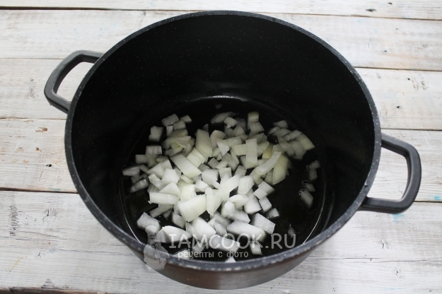 В казане разогрейте масло и до прозрачности потомите лук, масло впитает его аромат.