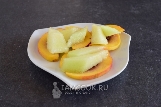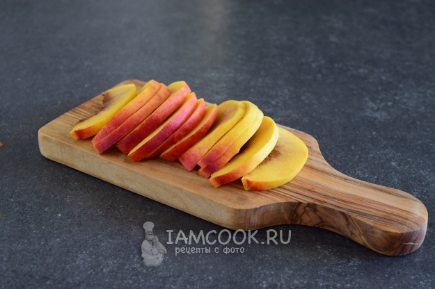 Нектарин разрезать пополам, удалить косточку, и каждую половинку фрукта нарезать слайсами.