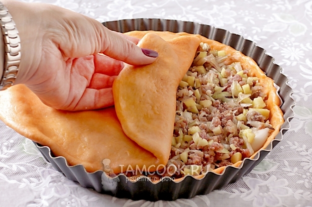 Выложите начинку и накройте второй частью теста. Тщательно защипайте края, чтобы при выпечке соки не вытекали.