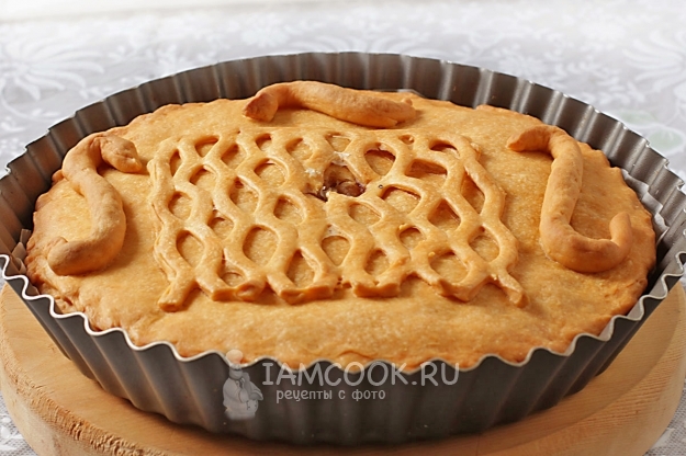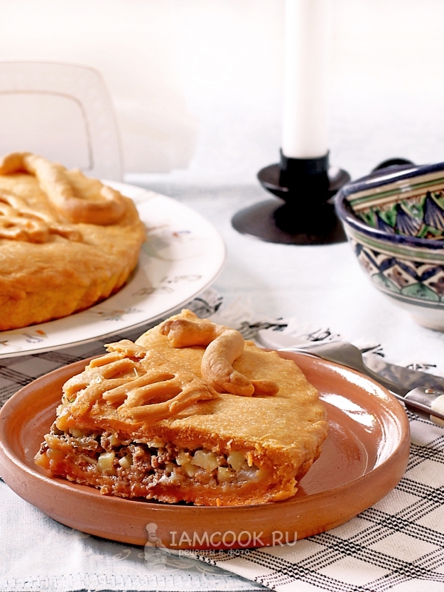Из обрезков можно сформировать что-то подобное)))). Жалко было выбрасывать. В центре обязательно сделайте отверстие, чтобы пар выходил. Выпекать пирог при 180 градусах 45 минут. Регулируйте температуру своей духовки, чтобы верх или низ не подгорел. Если нужно, то накройте пирог фольгой. За это время начинка обязательно приготовится и будет сочной. Еще можно проверить ее готовность, достав из отверстия кусочек картошки. Если время вдруг вышло, а начинка, по-вашему, еще сырая, то залейте в отверстие пару ложек кипятка.