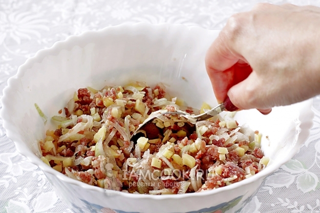 Соедините мясной фарш, репчатый лук и картофель. Посолите по вкусу, влейте ложку растительного масла и добавьте специи. Хорошенько перемешайте и начинка готова.