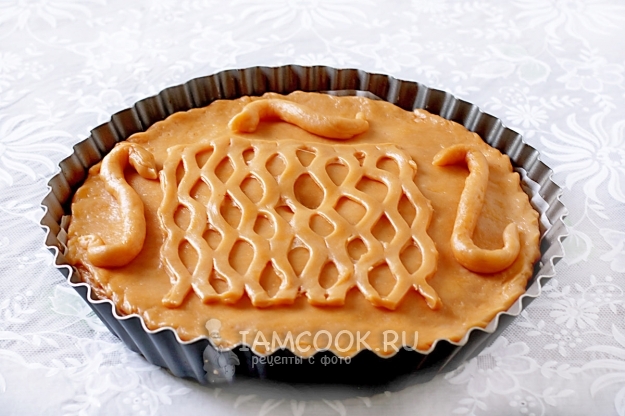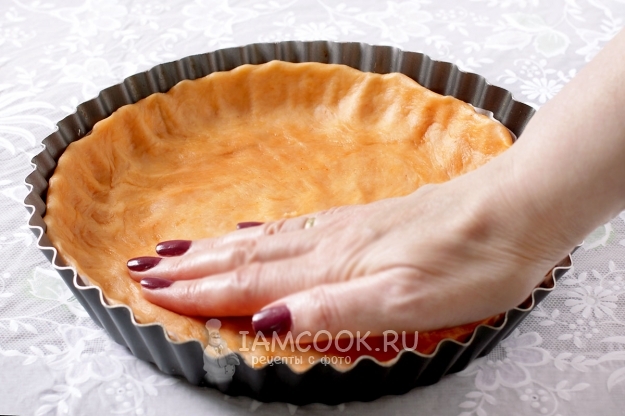 Тесто разделите на две части. У меня получилось многовато теста для данной формы, так что имейте это ввиду и раскатывайте его тоньше, чем у меня. Выложите слой теста в несмазанную форму. В тесте достаточно масла, чтобы оно не прилипало ко дну и бортикам.