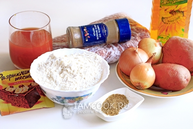 Итак, чтобы приготовить пирог с мясом на томатном соке, возьмите следующие продукты.