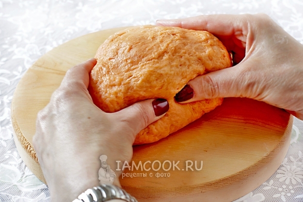 Замесите очень мягкое тесто. Так как в состав входит растительное масло, то даже мягкое тесто совсем не липнет к рукам. Накройте пленкой и положите в холодильник, пока будет готовиться начинка.