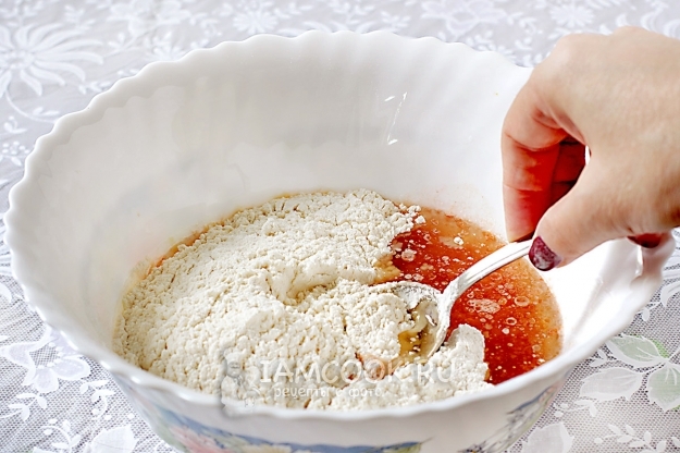 В удобной посуде соедините томатный сок, растительное масло, соль. Добавьте муку и разрыхлитель.