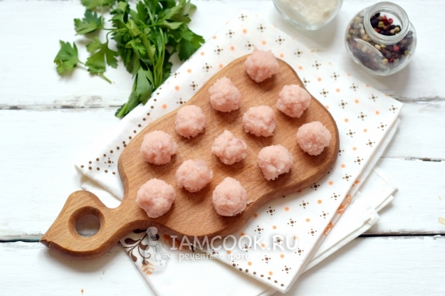 Филе или другую часть курицы без кости нарежьте произвольными кусками, поместите в контейнер блендера, перебейте до получения однородной массы. Для этого также можно воспользоваться мясорубкой. Полученный фарш приправьте солью и перцем по вкусу, перемешайте, сформируйте маленькие шарики.