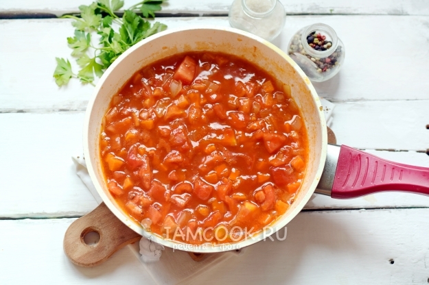 Помидоры поместите в морковно-луковую пассеровку, обжаривайте совместно еще 1 минуту. Следом добавьте томат-пасту и немного воды, чтобы паста равномернее распределилась по составу. Сковороду прикройте крышкой, томите томатную смесь с овощами примерно 5 минут на минимальном огне.