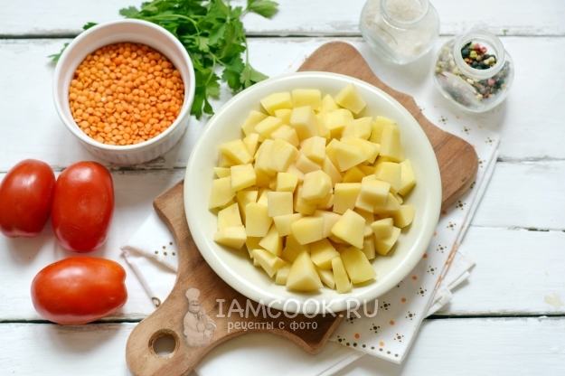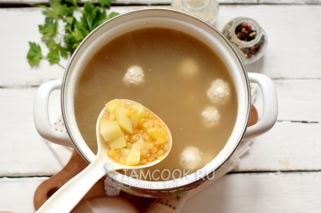 Когда вода в кастрюле закипит, посолите ее, киньте лавровый листок и нарезку картофеля. В этот же момент в суп можно добавить заготовки из фарша и чечевицу. Если вы не любите, когда чечевица сильно разваривается в супе, тогда загрузите ее через 5 минут после картофеля.