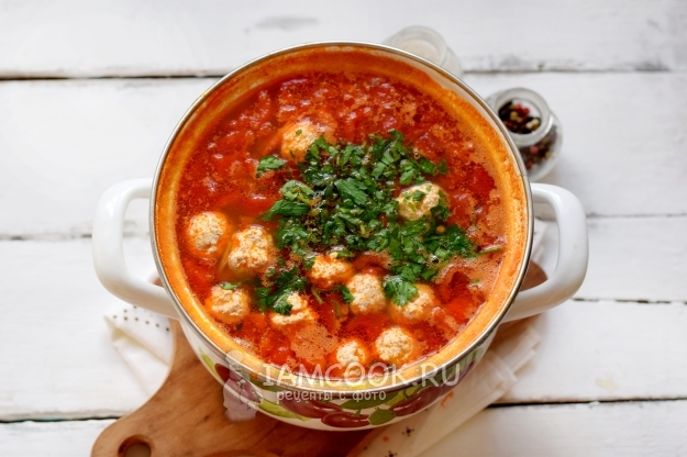 Когда картофель и чечевица станут мягкими, в суп перекиньте томатную заправку из сковороды. Зелень накрошите, отправьте в суп в самом конце. Попробуйте бульон на вкус, киньте недостающие специи. Доведите суп до кипения, уберите с плиты. Томатный суп с чечевицей и куриными фрикадельками готов.
