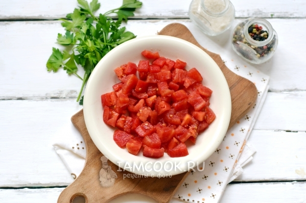 На кожице помидоров сделайте неглубокие надрезы, плод опустите буквально на минуту в горячую воду. Эта манипуляция позволит с помидоров легко снять кожицу. Мякоть нарежьте квадратиками среднего размера.