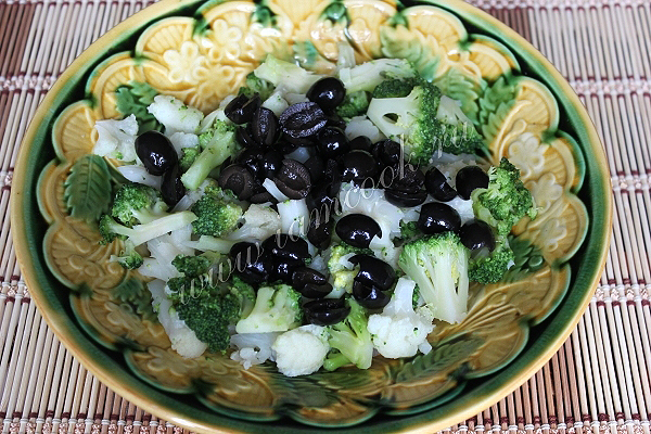 В салатник положите цветную капусту, брококли и маслины, разрезанные пополам.