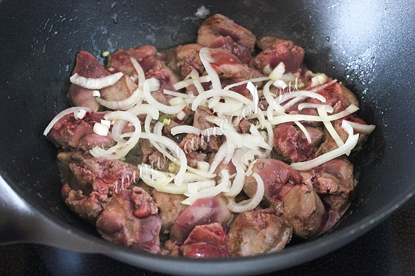 Куриную печень очистите, нарежьте кусочками среднего размера. Лук нашинкуйте, обжарьте и потушите их вместе на сливочном масле до готовности печени (с добавлением красного вина по желанию).