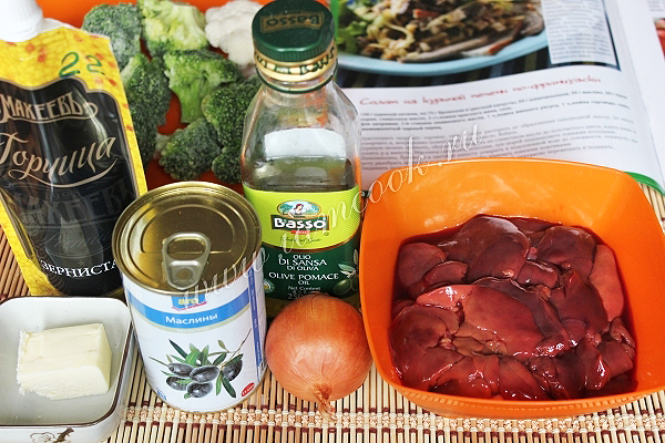 Подготовьте куриную печень, брокколи, цветную капусту, лук, маслины, сливочное и оливковое масло. по желанию красное вино, зернистую горчицу (как вариант: простую горчицу 1 ч. ложку и винный уксус 1 ч.ложку).