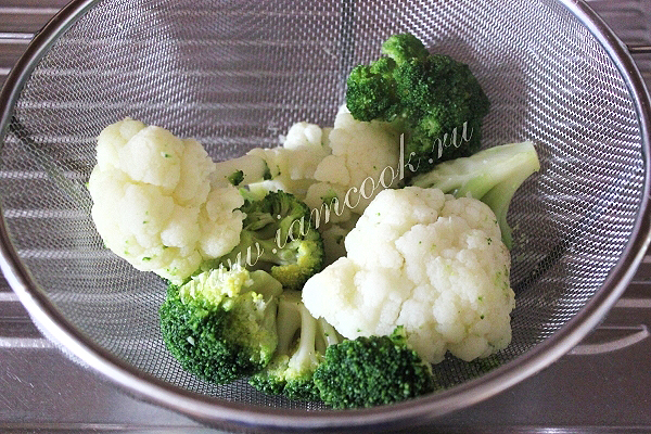 Брокколи и цветную капусту сварите, откиньте на дуршлаг и затем нарежьте на соцветия поменьше.