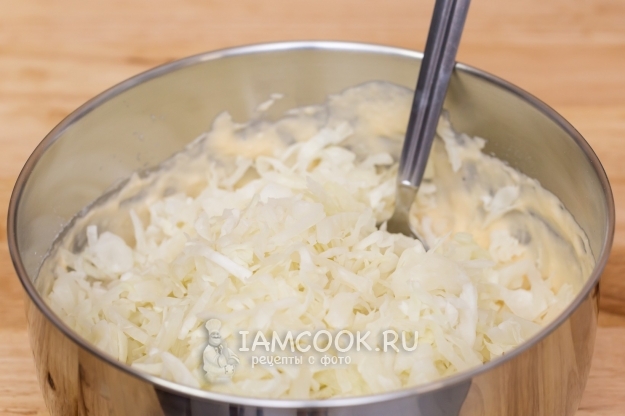 Добавим в тесто капусту (она не должна быть горячей!).