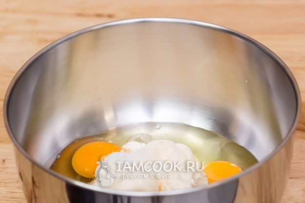 Смешиваем яйца, майонез, соду и соль. Взбиваем венчиком.