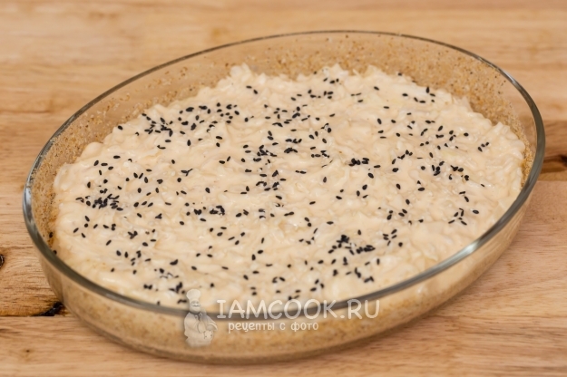 Выкладываем капустное тесто. По желанию можно присыпать кунжутом.