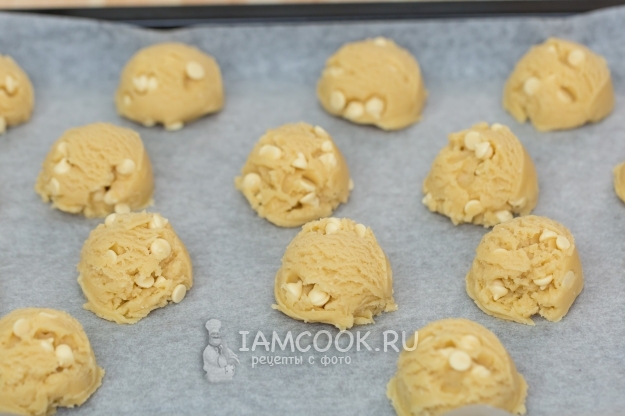Вооружаемся ложкой для мороженого и выкладываем заготовки на противень, застеленный пергаментом.