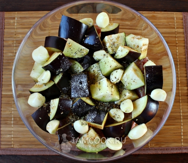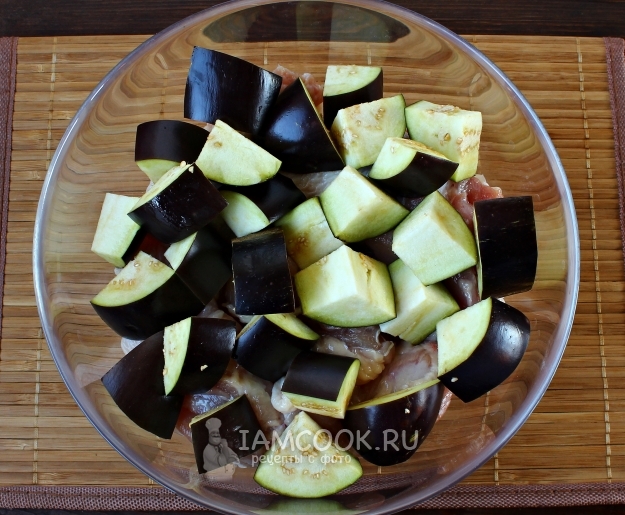 Баклажаны нарезаем средними кусочками и добавляем в миску, к курице.