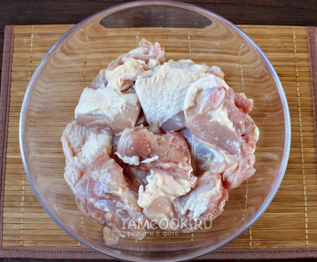 Куриные бедра моем, вырезаем кости. Полученную мякоть разрезаем на 2 части, если бедра большие, то разрезаем на 3 части.