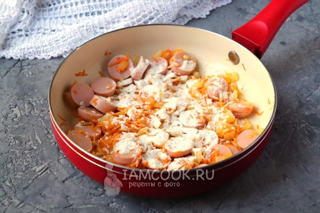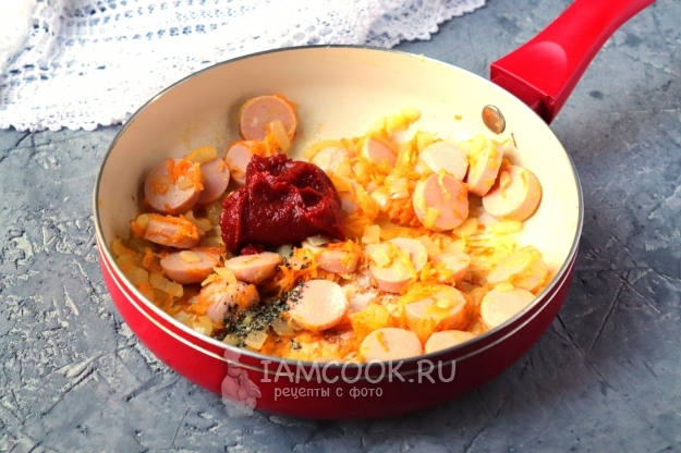 Сосиски очистите от плёнки и произвольно нарежьте: кубиками, полосками или кружочками. Выложите сосиски к обжаренным овощам.