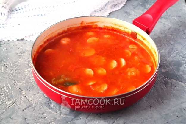 Накройте сковороду крышкой и томите подливу из сосисок к макаронам на медленном огне 10 минут.