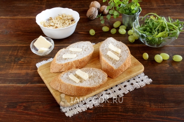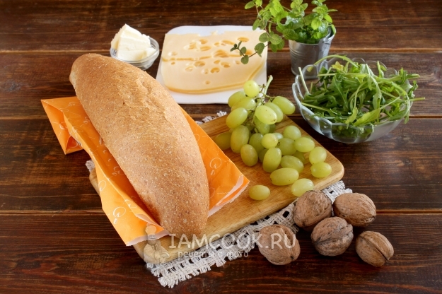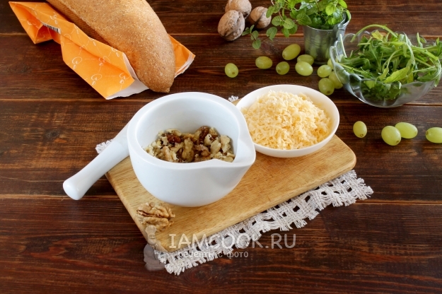 Чтобы приготовить брускетту с виноградом, орехами и сыром, возьмите продукты по списку. Заранее разогрейте духовую печь.