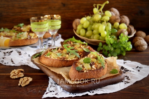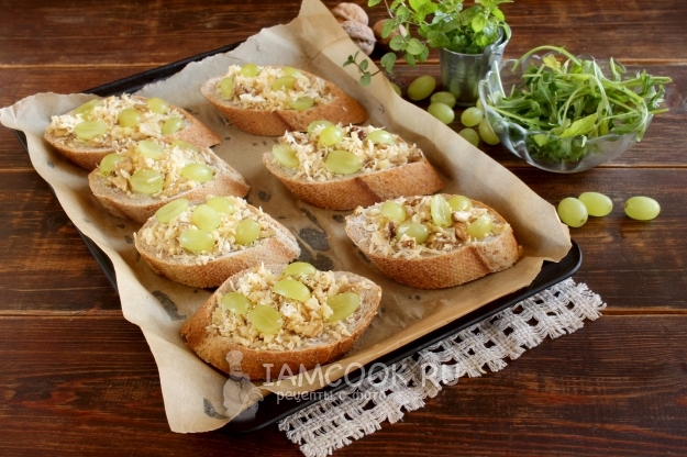 Для перекуса предлагаю запечь вкусную брускетту с виноградом, орехами и сыром. Проще использовать кишмиш без косточек, но сорт может быть любым. Орехи рекомендую грецкие — с выразительным ароматом, сыр — плавкий, сладковатый, с нотой топленого молока.