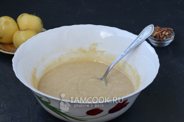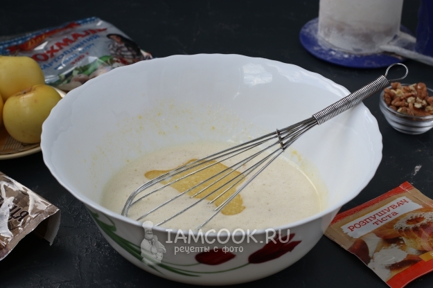 В несколько приёмов добавить сухую смесь к жидкой, тщательно перемешивая, чтоб не осталось комочков.