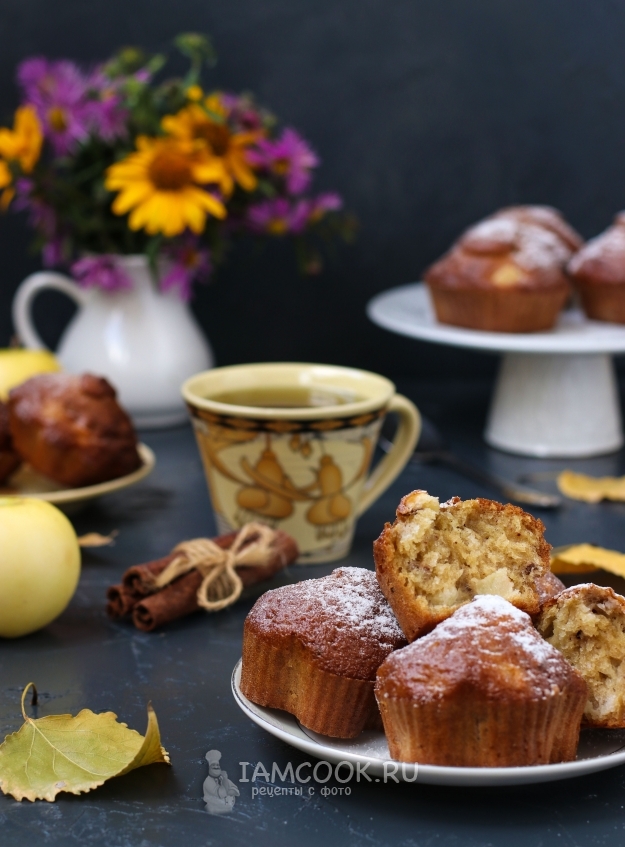 Внутри кексы с яблоками, орехами и корицей божественные - очень мягкие и ароматные! По желанию посыпаем кексы сахарной пудрой.