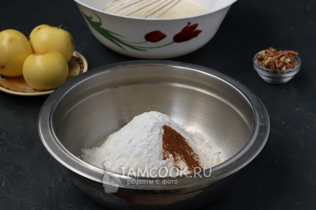 В отдельной ёмкости смешать муку, крахмал, разрыхлитель и корицу. Муку с разрыхлителем обязательно просеять сквозь сито. Также добавить соль.