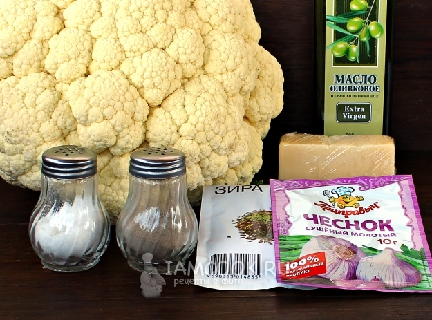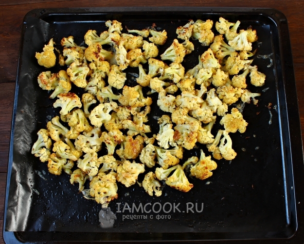 Помещаем его в духовой шкаф. Запекаем цветную капусту со специями при температуре 190-200 градусов 15-25 минут или до желаемой мягкости капусты. Чтобы капуста запекалась равномерно, в процессе запекания перемешайте ее пару раз. За 5 минут до окончания готовки посыпаем капусту сыром, натертым на мелкой терке.
