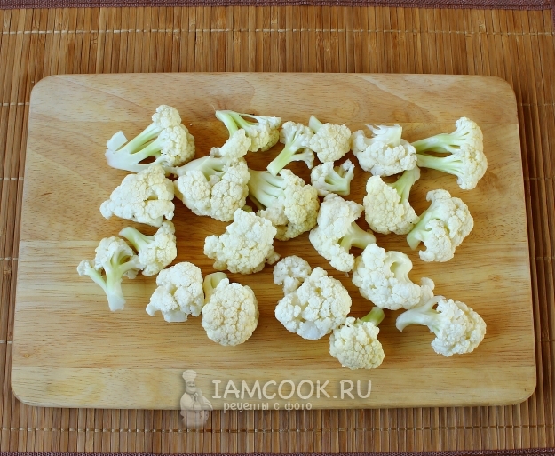 Кочан цветной капусты разделяем на небольшие соцветия. Выкладываем их в дуршлаг, промываем и обсушиваем.