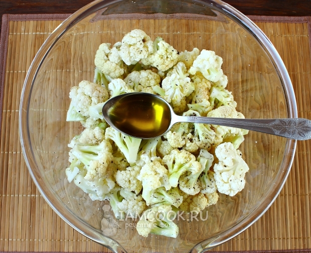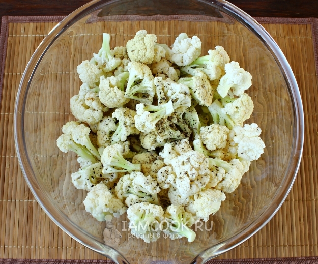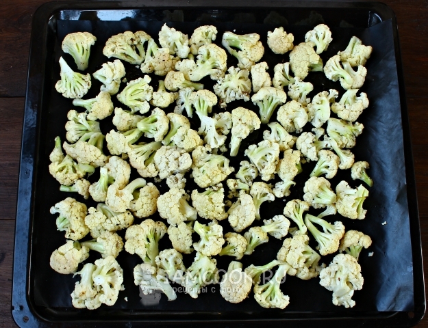 Выкладываем соцветия цветной капусты на противень, застеленный фольгой или тефлоновым/силиконовым ковриком.