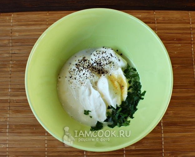 Для этого в миске соединяем сметану, сок лимона, соль, перец, сушеный чеснок и мелко нарезанную зелень: петрушку или укроп. Все хорошо перемешиваем, соус готов.
