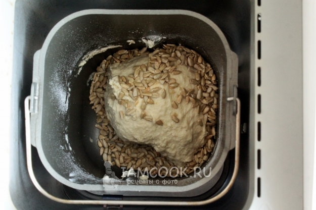 По сигналу к уже замешанному комку опускаем семечки, закрываем. Дальше второй замес, расстойка, выпекание пройдут без нашего вмешательства.